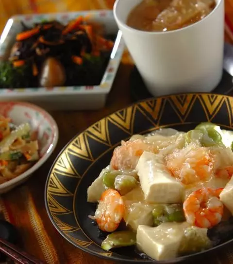 豆腐とエビ、それにソラ豆を加えたアッサリ塩炒め。