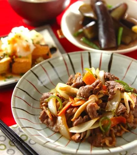 牛肉の炒め物はソース味! 副菜はやさしい味の含め煮に、サッパリ焼き厚揚げを添えて。