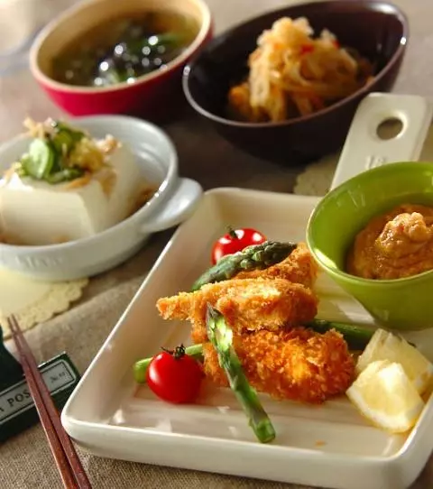 ささ身のカツはナッツの風味がおいしいソースでいただきます。ヘルシーな副菜とスープを添えてバランス良く!