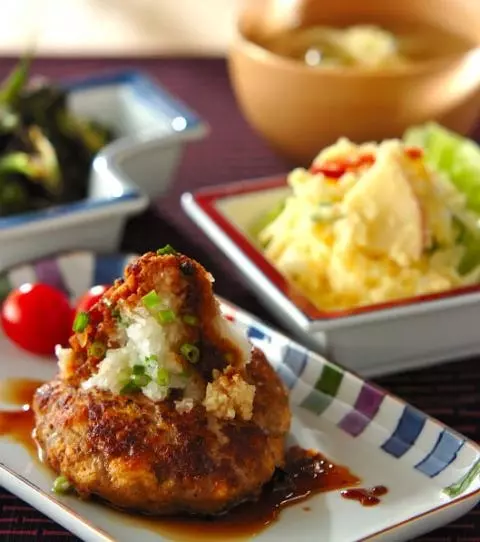 和風ハンバーグにポテトサラダを添えて。ワンプレートに盛りつけてもいいかも♪