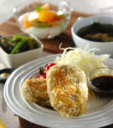 今日の献立は「牛ひき肉のコロッケ」を含めた全4品。