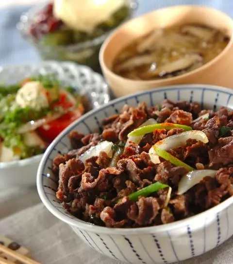 牛肉、玉ネギ、青ネギがたっぷり詰まった丼! 豪快に召し上がれ!