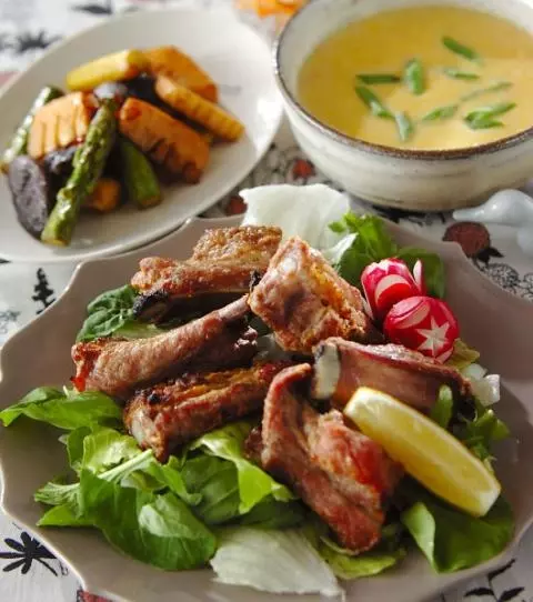 今日の献立は「骨付き豚バラ肉の塩焼き」