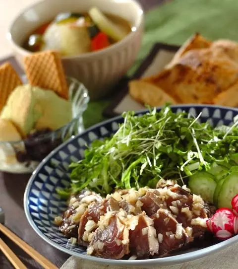 ニンニク、ショウガ入りのマリネ液がカツオによく合います。サラダ感覚でどうぞ!
