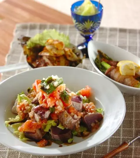 カツオは表面を焼きましょう。トマトソースをたっぷりからめて召し上がれ!