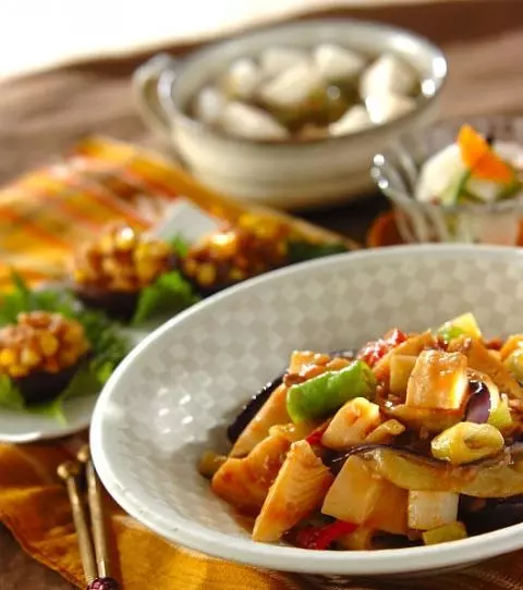 こってりとした麻婆ナスをメインに、副菜はヘルシー、サッパリとした味の2品を添えて。