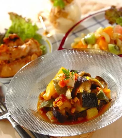 メインはたっぷり夏野菜を使ったトマト煮! 夏色満載の献立です!