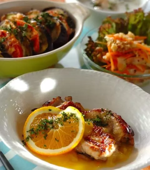 今日の献立は「チキンのオレンジソース」を含めた全4品。