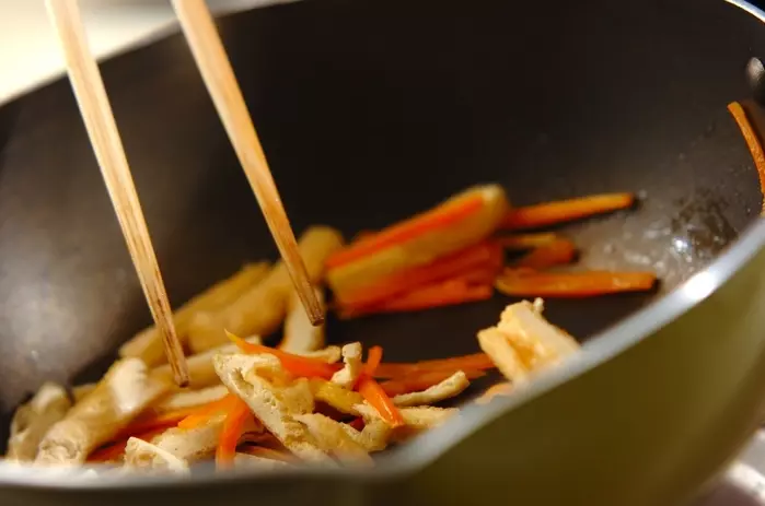 油揚げは全体に熱湯をかけ、ニンジンに合わせて細切りにする。