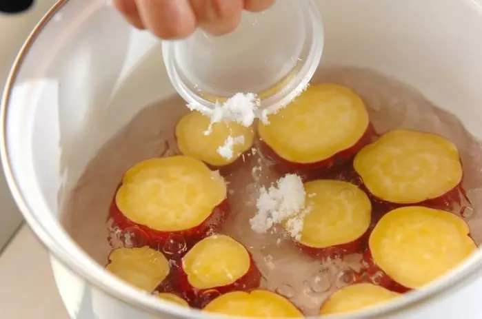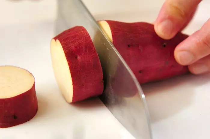 サツマイモは皮ごときれいに水洗いし、厚さ1.5cmの輪切りにして水に放つ。