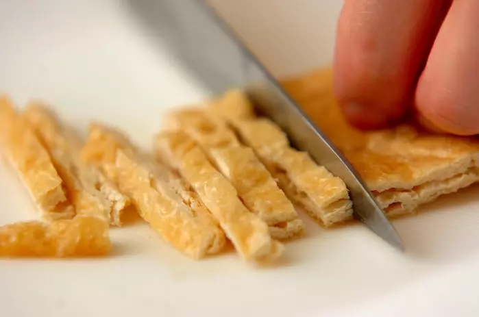 油揚げは熱湯をかけ、細切りにする。