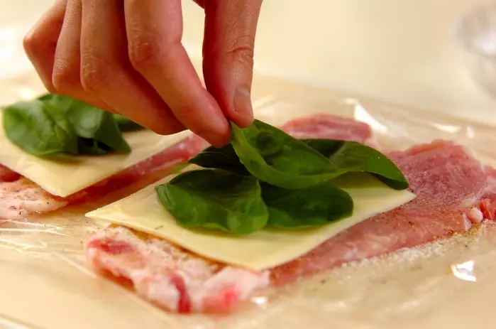 1. 豚肉に塩コショウをし、<衣>の小麦粉を薄く振り、半面にスライスチーズ、バジルをのせる。