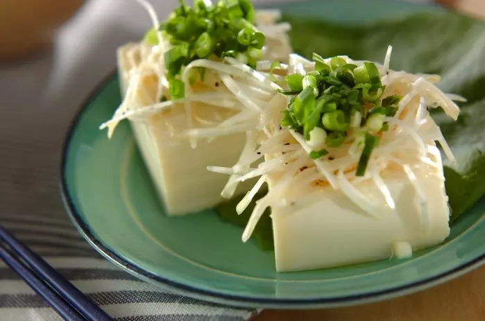 豆腐はサッと水洗いし、人数分で分けられるように切る。<ネギ油>の白ネギは長さ4~5cmの白髪ネギにする。