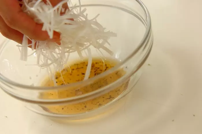 <ネギ油>の白ネギは長さ4~5cmの白髪ネギにする。