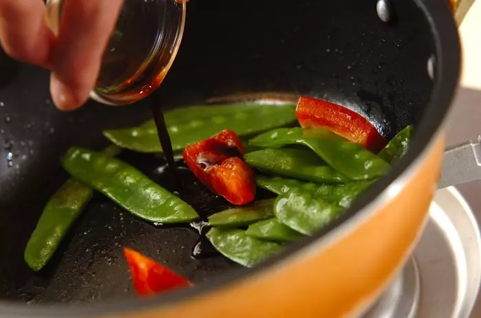 1. フライパンにサラダ油を強火で熱し、キヌサヤを炒める。薄く色がついたら赤パプリカを加え、サッと炒め合わせる。