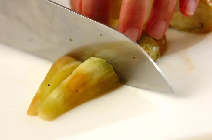 3. 器に(1)の焼きナスを入れ、(2)を注ぐ。