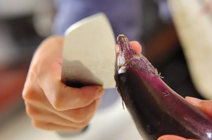 ナスはガクに1周切り込みを入れてきれいにむき、すりこ木などで軽く全体を叩く。