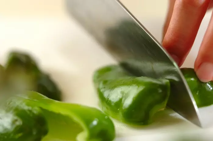 ピーマンは縦4つに切り、ヘタと種を取り除く。