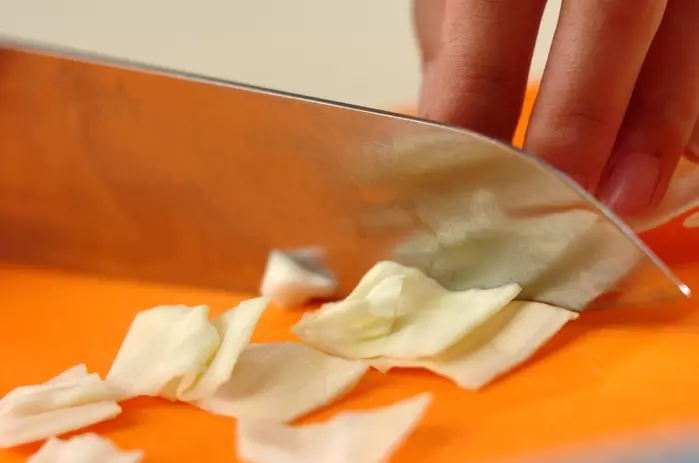 大葉は軸を切り落として縦半分に切り、さらに細切りにして水に放ち、水気を絞る。