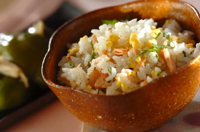 鮭、卵、大葉の色合いがキレイな混ぜご飯です。