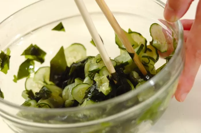 1. <合わせ酢>のボウルにキュウリ、ワカメを加えてサッと混ぜ、器に盛る。