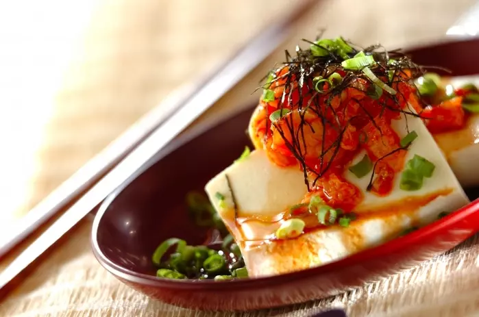 1. 器に絹ごし豆腐を盛り、白菜キムチ、刻みのり、刻みネギをのせ、<タレ>とゴマ油をかける。