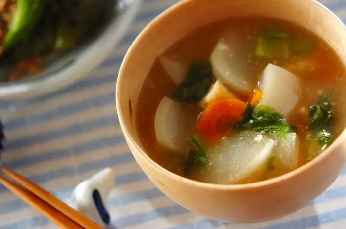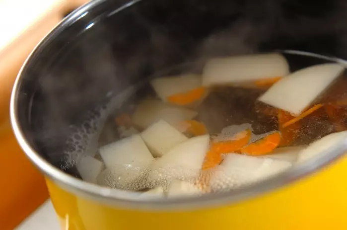 1. 鍋にだし汁、カブ、ニンジンを入れて強火で熱し、煮たったら火を弱める。