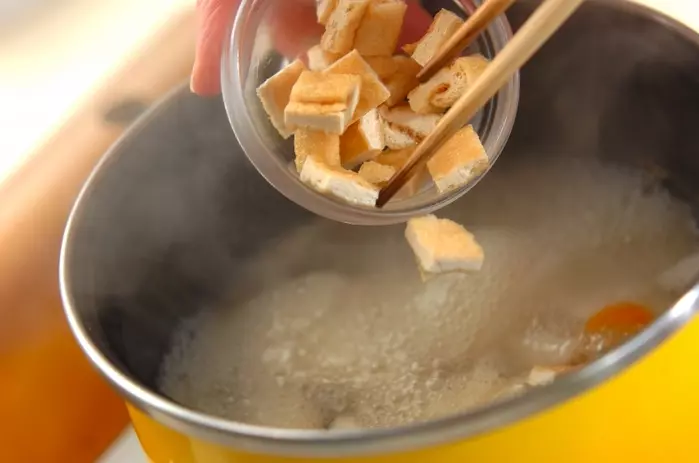 2. カブが透き通って柔らかくなったら、油揚げを加えて中火にする。