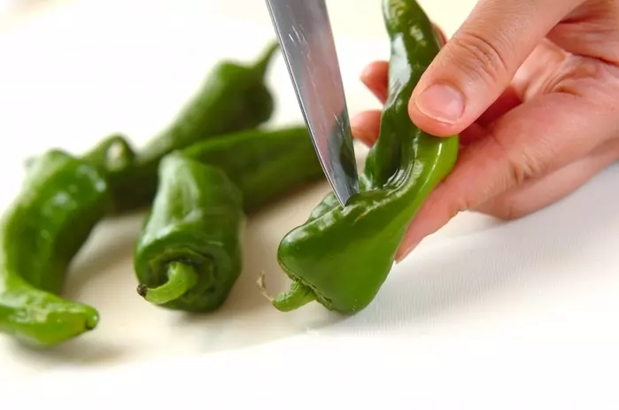 万願寺唐辛子は焼いた時に皮が弾けないように、包丁で突く。
