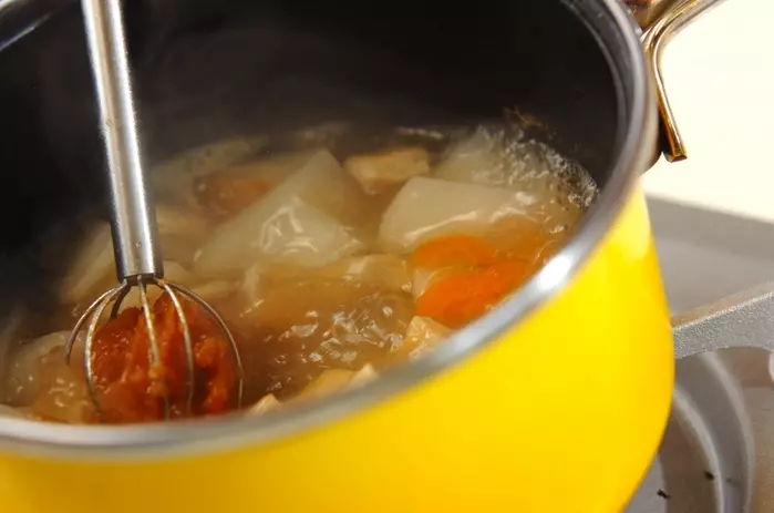 3. 煮たったらみそを溶き入れて火を止め、カブの葉を適量加えてひと混ぜし、器によそう。