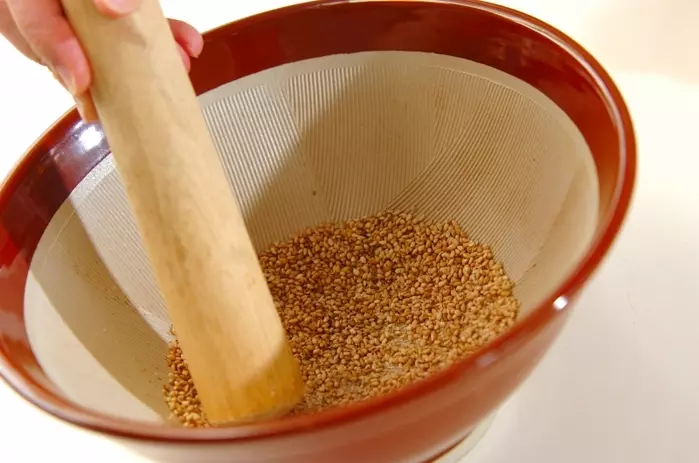 1. <合わせゴマみそ>を作る。フライパンに白ゴマを入れて焦がさないように香ばしく煎り、すり鉢ですりつぶし、他の材料と混ぜ合わせる。