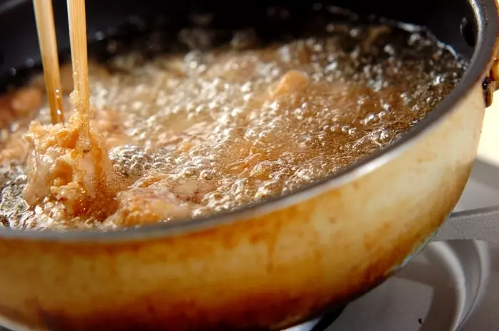 2. 160℃の揚げ油でじっくりカラッと揚げ、油をきる。