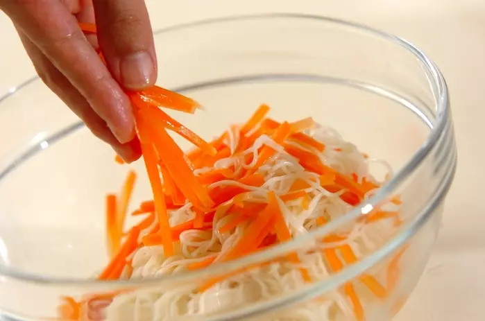 ニンジンは皮をむき、縦せん切りにする。