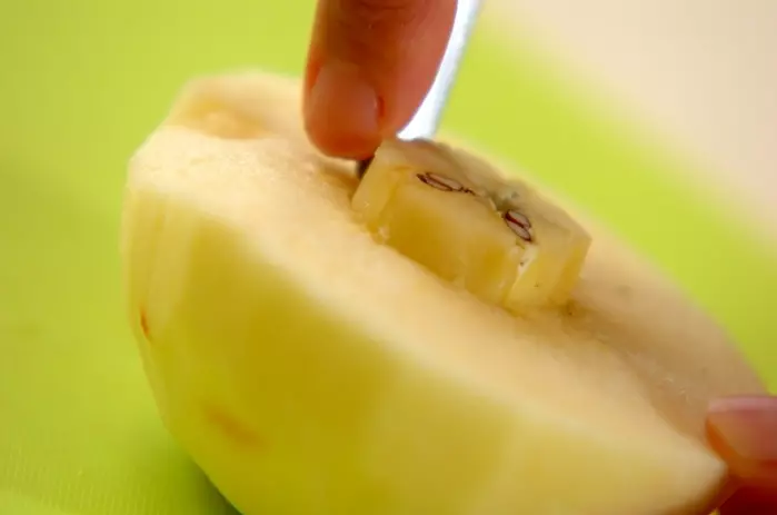 リンゴは皮をむいて横半分に切って芯をくり抜き、グラニュー糖とシナモンパウダーを全体にからめる。