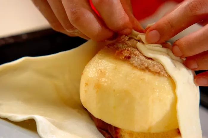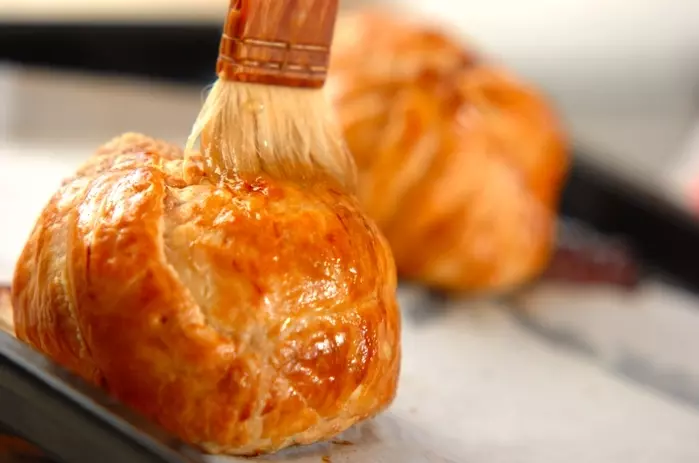 3. パイシートの縁に水を薄くぬり、リンゴを包み込む。しっかり押さえて<卵液>をぬり、180℃に予熱しておいたオーブンで45~50分焼く。