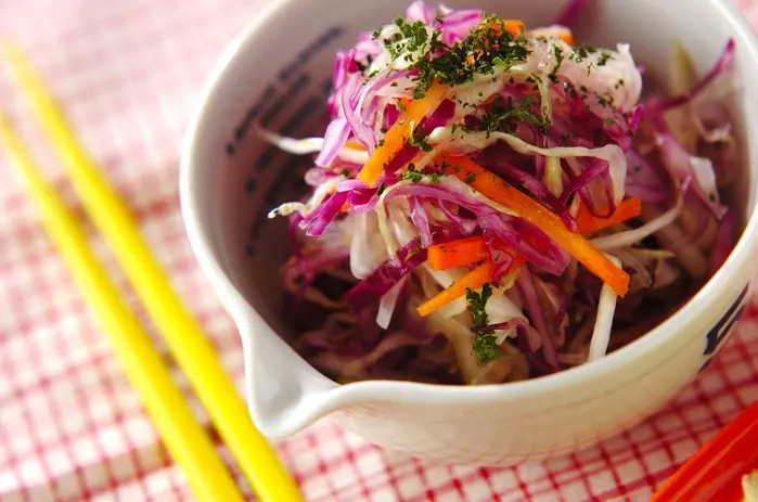 キャベツ、紫キャベツは、長さ4cmのせん切りにする。