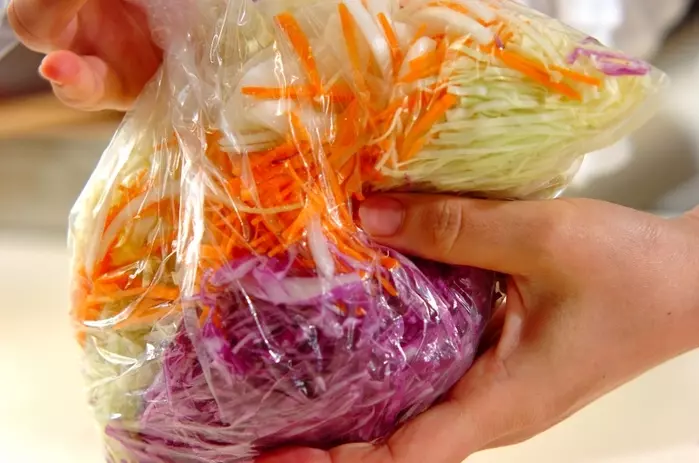 1. ビニール袋に、キャベツ、紫キャベツ、ニンジン、玉ネギ、分量外の塩を入れ、全体にしんなりするまでよくもむ。