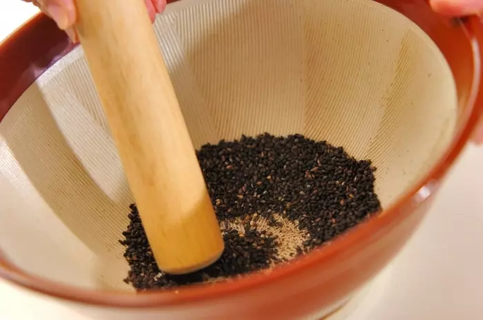 1. すり鉢に黒ゴマを入れてすり、他の<ゴマダレ>の材料を加えて混ぜ合わせる。