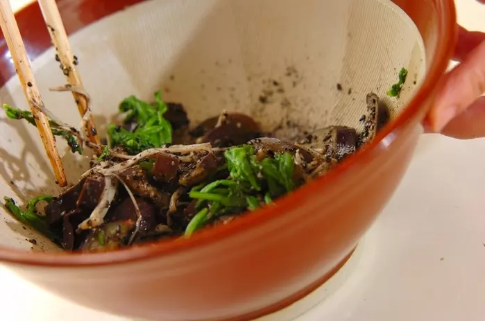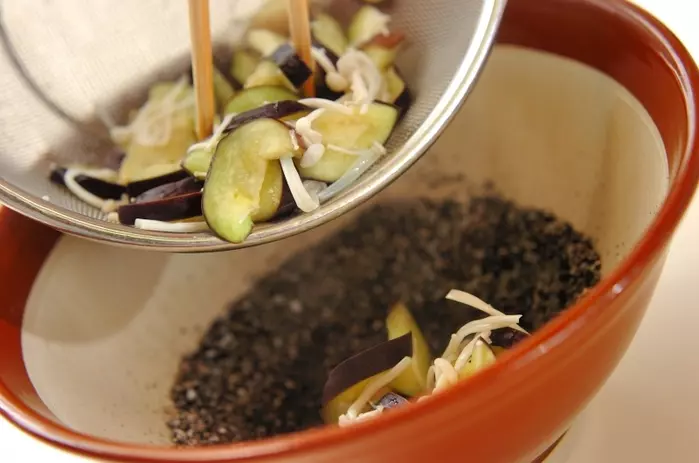2. たっぷりの熱湯でナス、エノキをサッとゆでてザルに上げる。お玉などで押さえて汁気をきり、熱いうちに(1)に加え、全体に混ぜ合わせる。
