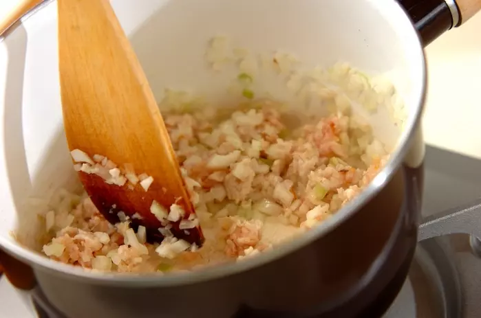 1. 鍋にオリーブ油、ニンニクを入れて中火で熱し、香りがたってきたら鶏ひき肉、玉ネギを加え、炒め合わせる。