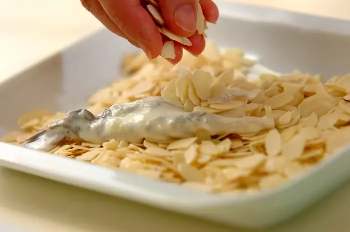1. エビは<衣>を通してスライスアーモンドをつけ、170℃の揚げ油でサックリと揚げる。