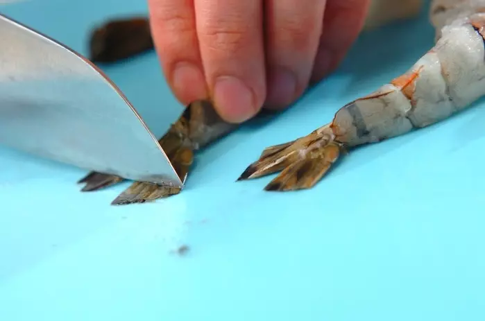 エビは殻をむいて背ワタを取り除き、腹側から切り込みを入れて1枚に開く。分量外の塩水で洗って水気を拭き取り、尾の先を少し切り落として包丁で水をしごき、塩コショウを振る。