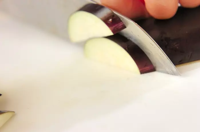 ナスはヘタを切り落とし、縦半分に切って厚さ5mmの斜め切りにし、塩水に放って水気をきる。