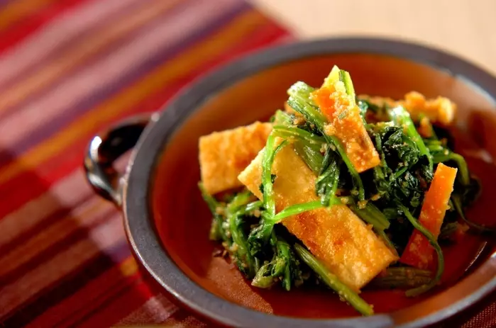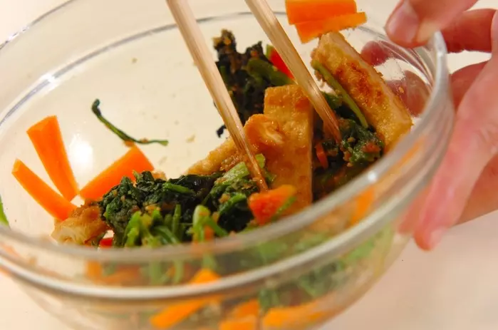 1. <合わせダレ>のボウルにホウレン草、春菊、ニンジン、油揚げを加えて和え、器に盛る。
