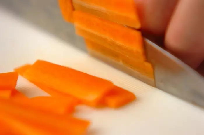 ニンジンは皮をむいて短冊切りにし、熱湯でサッとゆでてザルに上げ、水気をきる。