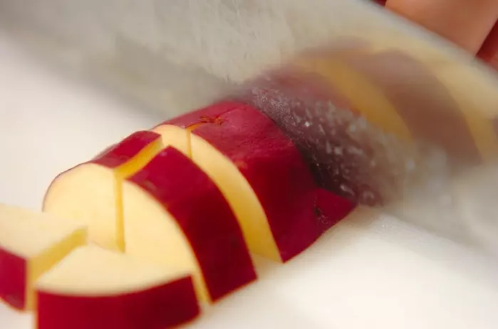 サツマイモは皮ごときれいに洗って縦4つに切り、さらに厚さ1cmのイチョウ切りにし、水に放つ。