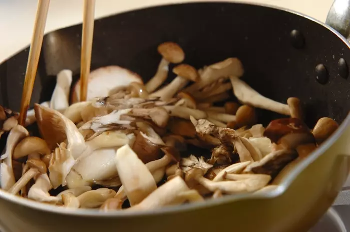 1. フライパンにバター、サラダ油を入れて強火で熱し、バターが溶け出したらシメジ、シイタケ、エリンギ、マイタケをサッと炒め、フライパンに蓋をして少し蒸し焼きにする。