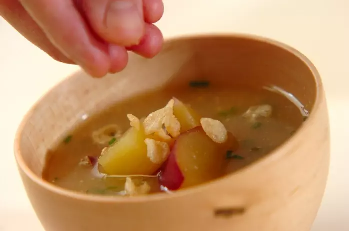2. サツマイモが柔らかくなったら、みそを溶き入れる。刻みネギを加えて器に注ぎ、天かすを散らす。