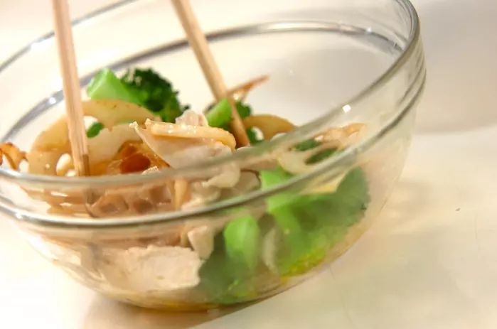 1. <マリネ液>の材料を混ぜ合わせ、鶏ささ身、レンコン、ブロッコリーを和えて器に盛り付ける。