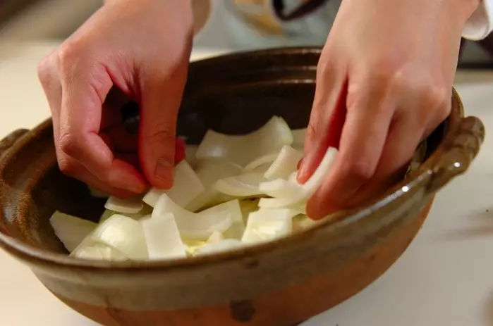 1. 鍋に白菜の芯と玉ネギをしきつめ、混ぜ合わせた<合わせだし>の材料を入れて蓋をして煮込む。